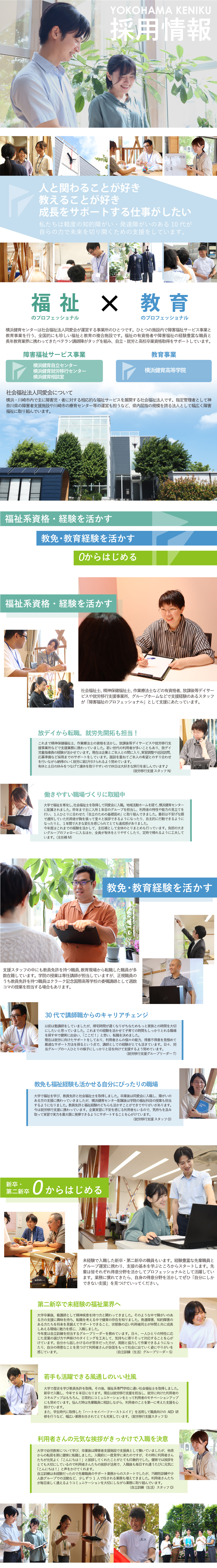 横浜健育センターは自立訓練(生活)と就労移行支援の2つの福祉サービスを提供する多機能型事業所です。生活支援員・職業指導員・就労支援員のいずれかとしてご勤務いただきます。