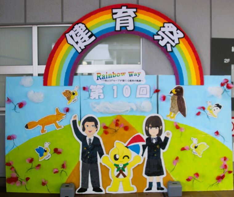 毎年、健育祭実行委員会が中心となり、テーマをイメージした看板やポスターを生徒・利用者、全員で協力して作り、会場内に展示します。