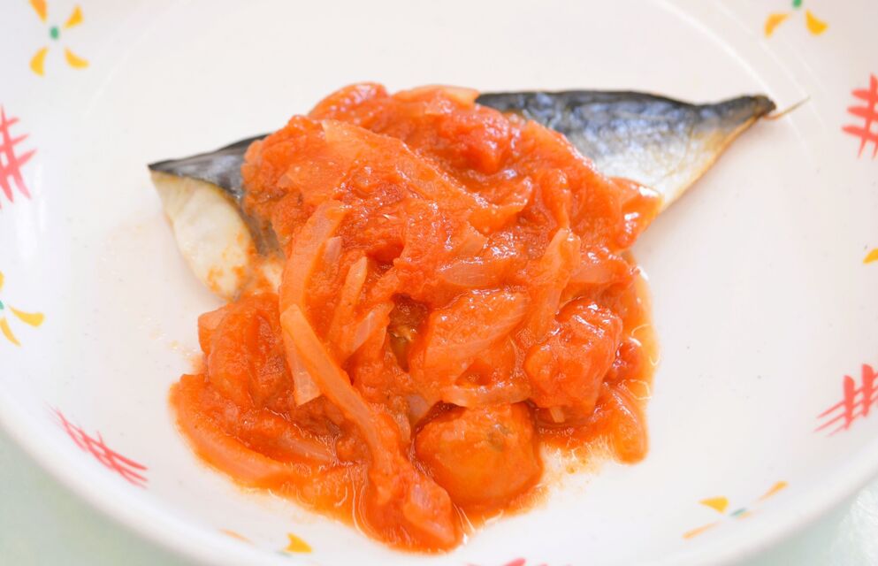 こんがりと焼いたサバに玉ねぎたっぷりの濃厚なトマトソースをかけちゃいました。