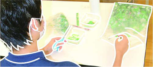 よりステップアップを目指す就労移行グループでは、横浜健育センターの施設内の管理を担っています。施設内清掃やごみ回収などの基本的なことから、トイレ清掃、屋外清掃、ワックスがけ等のより専門的な作業を行います。また、植栽管理や野菜栽培などのグリーンサービスも重要なプログラムの一つ。できた野菜は厨房で調理し、ランチで提供しています。